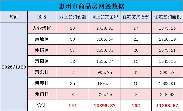 1月19日惠州市各县区二手房网签情况大亚湾区网签67套,面积6168.39㎡;惠城区99套,9318.91㎡;仲恺区28套,3184.28㎡;惠阳区35套,2994.82㎡;惠东县47套,7034.59㎡;博罗县 0 套,0㎡;龙门县9套,1776.97㎡。合计285套,30477.96㎡。1月20日惠州市各县区商品房网签情况大亚湾区网签23套,面积2019.91㎡;惠城区30套,3165.69㎡;仲恺区37套,3550.86㎡;惠阳区18套,1585.37㎡;惠东县8套,905.95㎡;博罗县25套,1895.4㎡;龙门县3套,276.19㎡。合计144套,13399.37㎡。