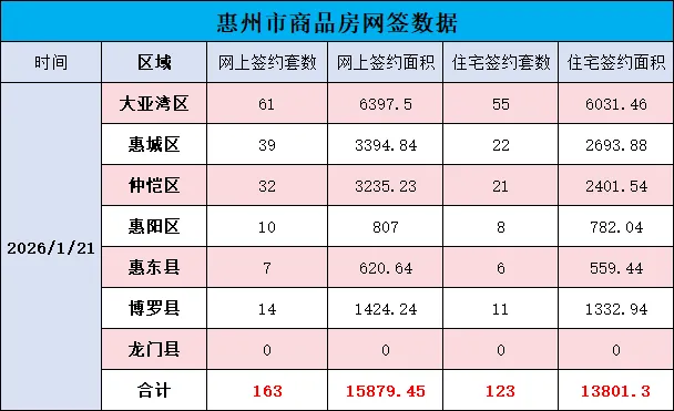 1月20日惠州市各县区二手房网签情况大亚湾区网签60套,面积13357.09㎡;惠城区74套,6606.87㎡;仲恺区16套,1101.34㎡;惠阳区39套,3827.78㎡;惠东县42套,4125.09㎡;博罗县 0 套,0㎡;龙门县5套,288.44㎡。合计236套,29306.61㎡。1月21日惠州市各县区商品房网签情况大亚湾区网签61套,面积6397.5㎡;惠城区39套,3394.84㎡;仲恺区32套,3235.23㎡;惠阳区10套,807㎡;惠东县7套,620.64㎡;博罗县14套,1424.24㎡;龙门县0套,0㎡。合计163套,15879.45㎡。