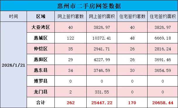 1月21日惠州市各县区二手房网签情况大亚湾区网签40套,面积3826.97㎡;惠城区122套,10372.41㎡;仲恺区35套,2941.71㎡;惠阳区29套,4227.99㎡;惠东县34套,3746.59㎡;博罗县 0 套,0㎡;龙门县2套,331.55㎡。合计262套,25447.22㎡。来源:大亚湾楼市整合自大亚湾经济技术开发区网,采用旨在分享,如有侵权,请联系删除。