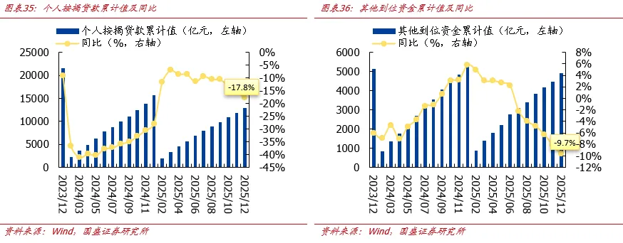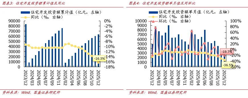 2025年底开发投资相关指标累计同比加速下跌,相关指标近年大概率持续承压。2025全年看,房地产开发投资相关的多数指标在较低基数上继续负增,其成因我们在此前报告中已多次提示:投资额、新开工、施工、竣工等属于滞后指标,滞后反映销售、拿地情况,因此近年这些指标承压是大概率事件。同时叠加年末新房销售较平淡、房企资金面进一步趋紧、保交楼推进情况、部分指标2024年底基数小幅抬升等因素,2025年底多数指标累计同比呈现加速下跌走势,对经济持续负贡献。我们认为政策方面仍有待加力提振市场各方信心。我们预测2026年新开工面积5.3亿方(-10%),竣工面积5.3亿方(-12%),施工面积56.5亿方(-12.3%),房地产开发投资额为7.57万亿元(-10.9%),具体预测逻辑和模型详见我们2025年12月25日外发报告《2026年度策略:在下一个台阶等政策,结构和分化是主旋律》。
