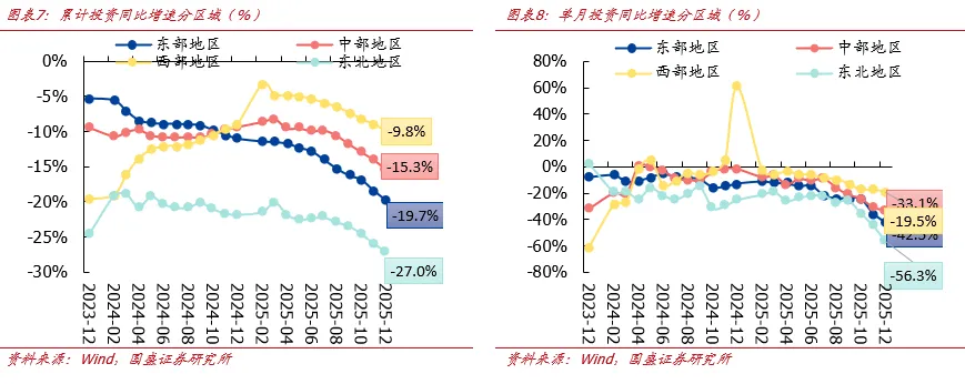 全年东部、中部、西部、东北等地区开发投资额同比分别-19.7%、-15.3%、-9.8%、-27.0%。