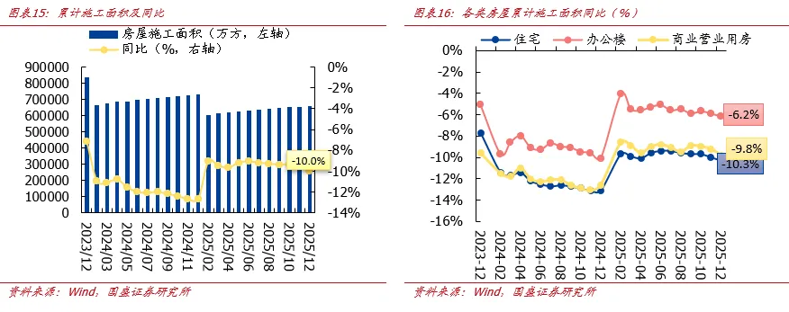 2025全年施工面积同比-10.0%。施工面积趋势性下行,拖累开发投资。