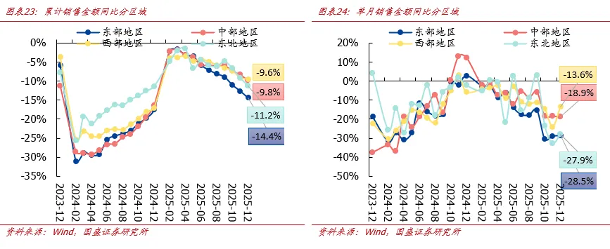 1-12月份东部、中部、西部和东北地区累计销售金额分别为50210、15684、15811和2232亿元,同比分别为-14.4%、-9.8%、-9.6%和-11.2%,较前值变动-1.8pct、-1.4pct、-0.5pct和-2.0pct。12月单月东部、中部、西部和东北地区销售金额分别为5197、1782、1637和191亿元,同比分别为-28.5%、-18.9%、-13.6%和-27.9%,较前值变动0.3pct、-0.5pct、10.4pct和4.9pct。