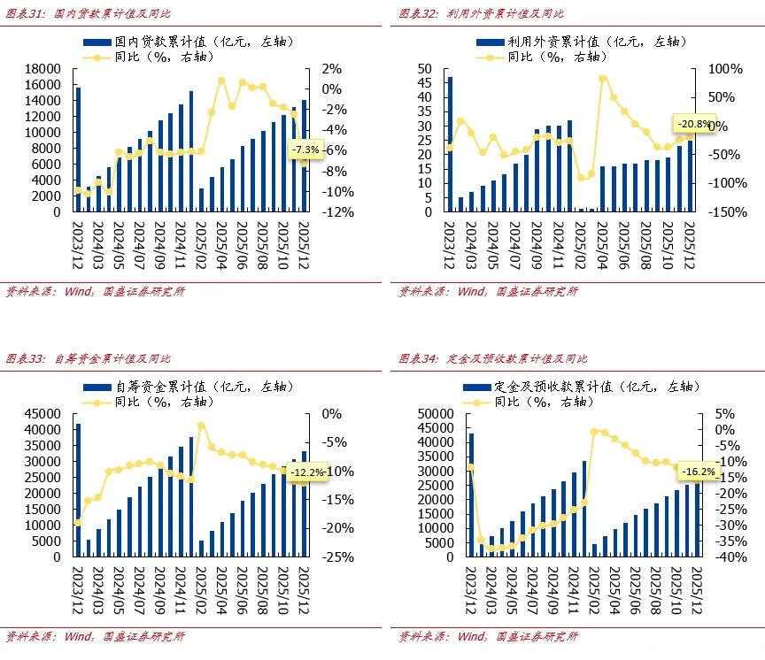 2025全年房企到位资金累计同比-13.4%继续负增,其中个人按揭贷款、定金及预收款为主要拖累项,国内贷款年末累计同比跌幅也显著扩大。1-12月份,房企到位资金累计值为93117亿元,同比减少13.4%,较前值降低1.5pct;12月单月到位资金为7972亿元,环比增长26.7%,同比减少28.1%,较前值提高4.5pct。房企各项资金来源中,国内贷款、利用外资、自筹资金、定金及预收款、个人按揭贷款累计值分别为14094、25、33149、28089和12852亿元,同比分别为-7.3%、-20.8%、-12.2%、-16.2%和-17.8%,较前值分别-4.8pct、3.8pct、-0.3pct、-1.0pct和-2.7pct。维持行业“增持”评级。我们认为重点关注房地产相关股票有以下理由:1、政策受基本面倒逼进入深水区,如我们2022、2023年在报告中反复阐述,认为本轮最终政策力度超过2008、2014年,而现在尚在途中。2、地产作为早周期指标,具备指向性作用,配置地产相当于配置经济风向标。3、行业竞争格局改善逻辑依旧适用,拿地和销售表现优异的依然是头部国央企和少量混合所有制及民企,品质房企有望在未来的格局中更加受益。4、我们观点“只看好一线+2/3二线+极少量三线城市”依然奏效,这个城市组合在销售前期偶尔反弹时表现更好也得到了印证。5、供给侧政策,收储、妥善处置闲置土地等政策有新变化,依然是观察落地最重要的方向,且可以预见,一二线仍然更受益。基于以上,我们认为2026年仍然是以政策为核心主导力量,板块反复做政策beta,配置方向可选:(1)地产开发:H股的绿城中国、建发国际集团、华润置地、越秀地产、中国海外发展、中国金茂;A股的滨江集团、招商蛇口、建发股份、保利发展、华发股份;(2)地方国企/城投/化债:城建发展、城投控股;(3)中介:贝壳-W;(4)物业属于跟涨:华润万象生活、招商积余、绿城服务、保利物业、中海物业等。