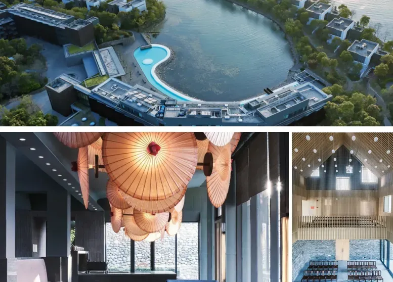 2.由曹慰祖、张永和等著名建筑师设计,融合东方文化与西方科学,采用旧船木、火山石等环保材料,空间营造富有禅意,光影设计别具匠心。其典礼堂获英国Blueprint Awards及亚太区室内设计大奖。