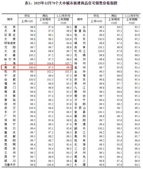 国家统计局数据也印证了“止跌回稳”的态势:1月19日,国家统计局公布的数据显示,南京2025年12月新房价格环比持平,继2025年11月微涨后,南京新房价格继续止跌回稳。