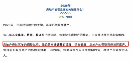 · 经济学家马光远指出:2026年,中国经济稳住的关键,其实仍然是房地产。房地产经过五年的调整以后,无论是市场调整的深度,还有长度,房地产的调整已经接近尾声。
