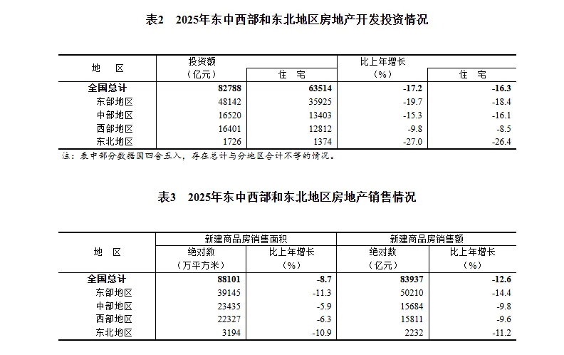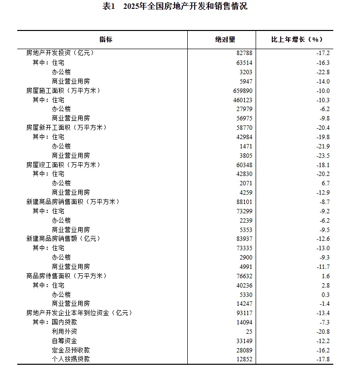 1月19日,国家统计局今日公告,2025年全国房地产开发投资82788亿元,比上年下降17.2%;其中,住宅投资63514亿元,下降16.3%。