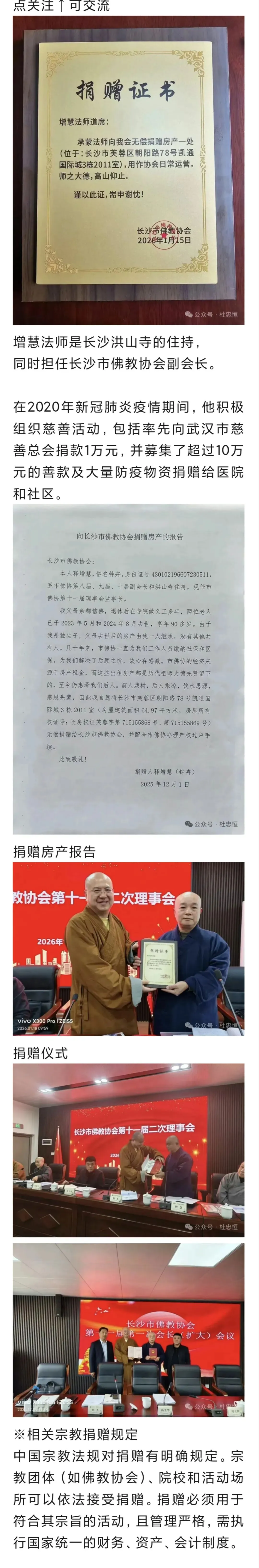 2025年12月1日,增慧法师正式提交捐赠报告,2026年1月15日,长沙市佛教协会向其颁发了捐赠证书。