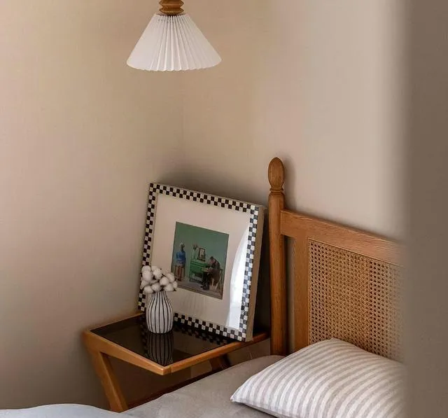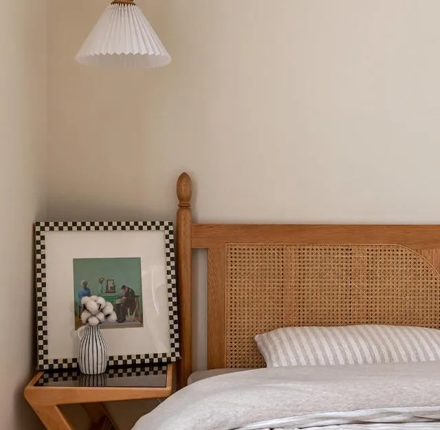 卧室部分,小姐姐就追求一个字:“静”!没有多余装饰,只有原木床、米白色床品和温柔的床头灯。尤其墙上那一幅小风景画,点亮了整个氛围,晚上开灯的时候,满屋都是暖烘烘的光晕,安全感直接拉满!