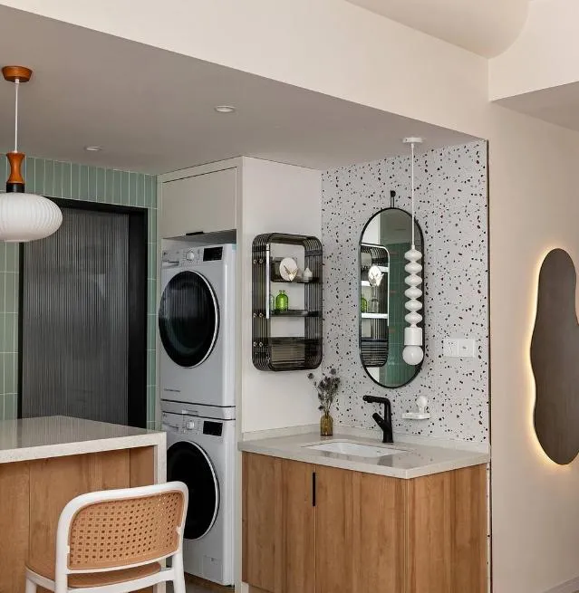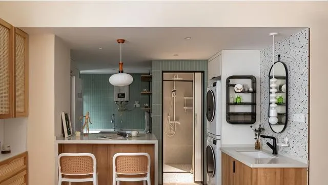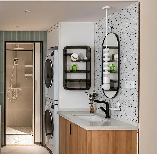 说到卫生间,小姐姐真的是把每一寸空间都安排得明明白白!墙面是时下很流行的水磨石,高级感一下就来了。洗漱区和洗衣区外置,洗衣机烘干机全都嵌进去,看起来整整齐齐,收纳能力超强!