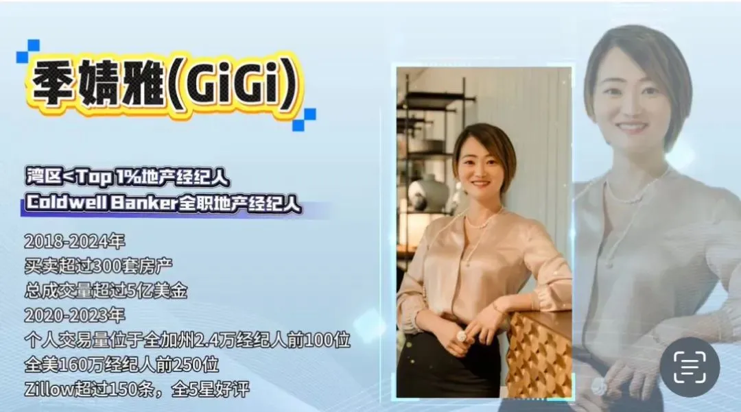 ●季婧雅(Gigi) 湾区< Top 1%地产经纪人 ,Coldwell Banker全职地产经纪人。2018-2024年,买卖超过300套房产,总成交量超过5亿美金。2020-2024,个人交易量位于全加州2.4万经纪人前100 位,全美160万经纪人前250位。Zillow超过150条,全5星好评。