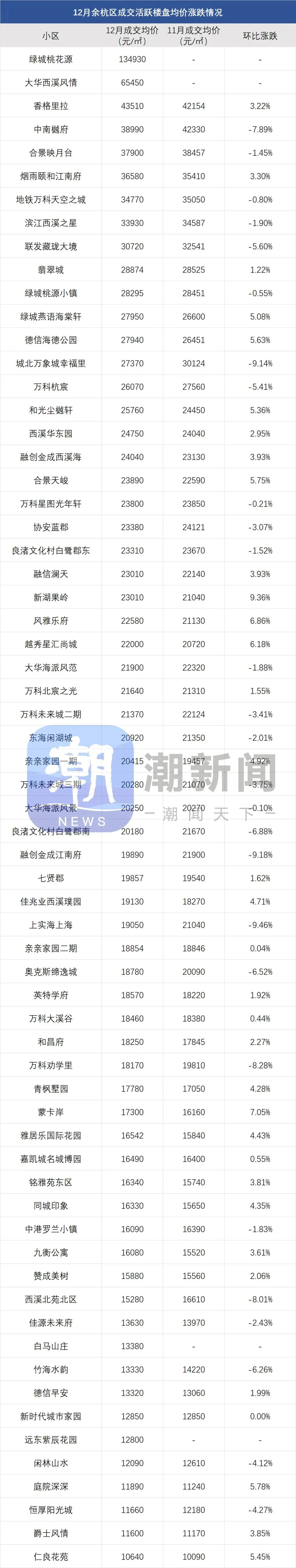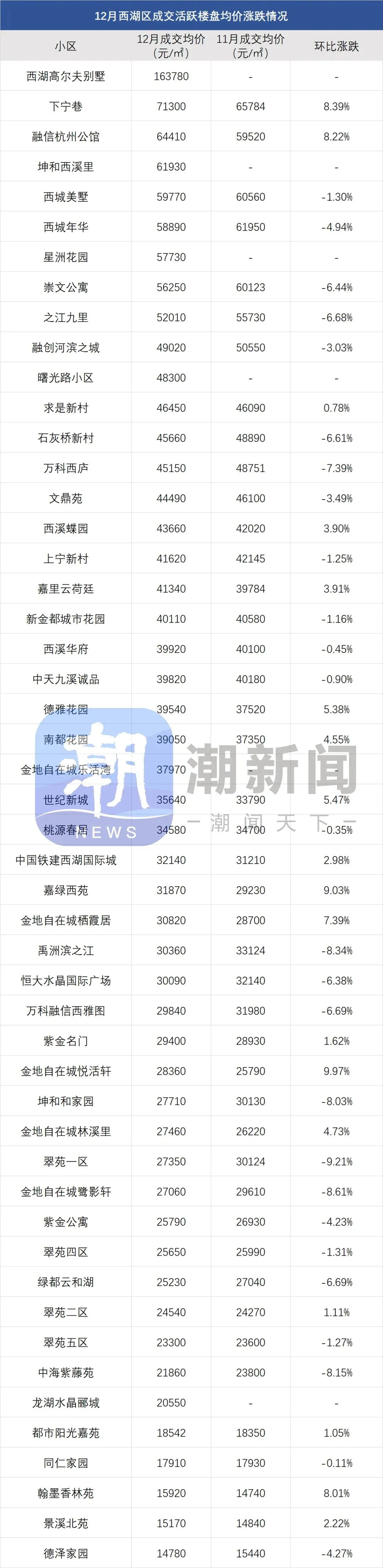 望江新城的江明月朗园,成交价重回“7字头”,12月成交均价72040元/㎡,环比涨幅6.79%。江河汇区域的留香园,12月成交均价68550元/㎡,环比涨幅2.77%。申花板块多个次新小区房价小幅回弹:馥香园、荟品天语城均价都在6万+,涨幅均超2%;星瓒颂锦府、杭曜置地中心、融信蓝孔雀等涨幅也在1%-2%左右。