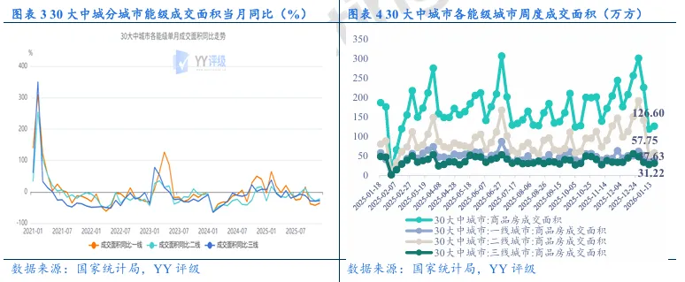 高频数据:30大中城市商品房于2026年1月第一周(2026.01.05-2026.01.11)成交119.21万平,环比下跌47.35%,同比下跌38.40%;于2026年1月第二周(2026.01.12-2026.01.18)成交126.60万平,环比上涨6.20%,同比下跌32.42%。总量层面第一周同环比均下跌,第二周环比上升、同比延续下跌。