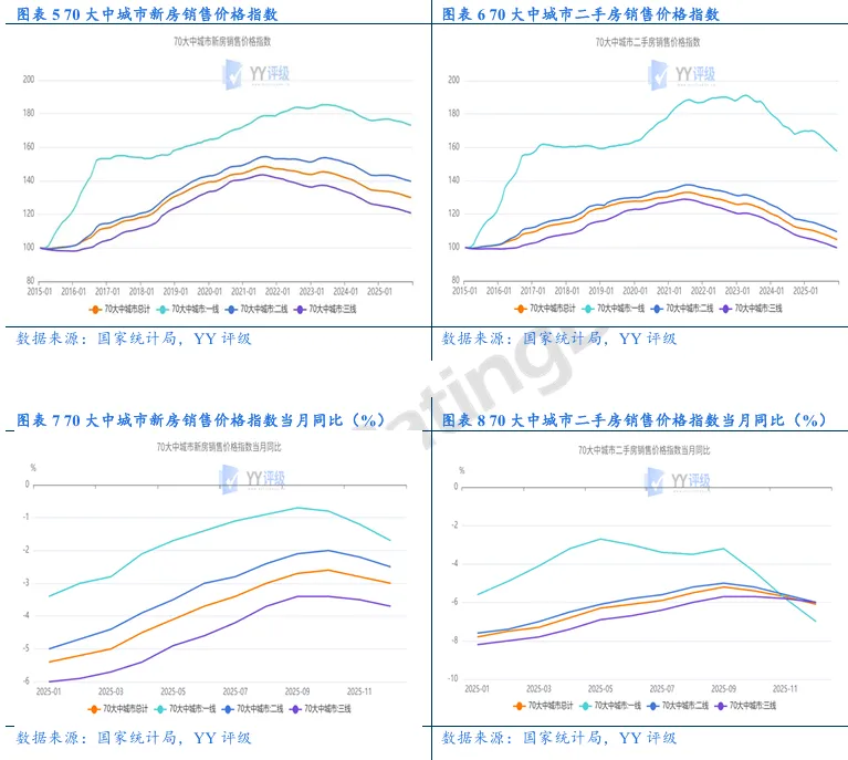 新房市场:各能级城市新房成交价格同比跌幅加深,其中一线城市同比跌幅扩大较多。2025年12月,70大中城市新建商品住宅价格指数同比下跌3.00%,较11月跌幅继续扩大0.20pct;一线、二线和三线城市分别同比下跌1.70%、2.50%和3.70%,较11月跌幅分别扩大0.50pct、0.30pct和0.20pct。
