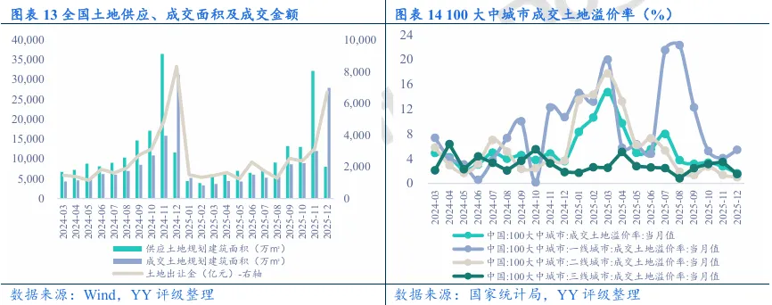 土地成交:全国土地供给下滑,成交量边际上升,各能级城市成交溢价率表现分化,一线城市回升,二线城市持续下跌,三线城市溢价率大幅下跌。2025年12月全国供应土地规划建筑面积(土地类型为住宅类用地和商服用地,下同)0.80亿平,同比减少30.92%(2025年11月同比-11.59%),环比减少75.20%(2025年11月环比+148.25%);成交土地规划建筑面积2.78亿平,同比减少10.86%(2025年11月同比-24.32%),环比上升132.86%(2025年11月环比+34.78%);成交土地出让金合计0.67万亿元,同比减少19.55%,环比增长114.15%。100大中城市2025年12月成交土地溢价率1.64%,环比下降1.10pct,其中一线城市溢价率环比上涨1.35pct至5.42%,二线城市溢价率环比下跌0.31pct至1.05%,三线城市溢价率环比下跌1.99pct至1.49%。