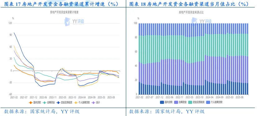 2025年1-12月房地产开发资金总量持续收缩,各融资渠道同比跌幅加深。2025年1-12月,房地产开发资金累计达93,117亿元,累计同比下跌13.40%,跌幅较2025年1-11月扩大1.50pct。按融资渠道,国内贷款收缩表现最为显著。国内贷款、自筹资金、定金及预收款和个人按揭贷款累计同比跌幅分别为7.30%、12.20%、16.20%和17.80%,分别较2025年1-11月跌幅扩大4.80pct、0.30pct、1.00pct和2.70pct。