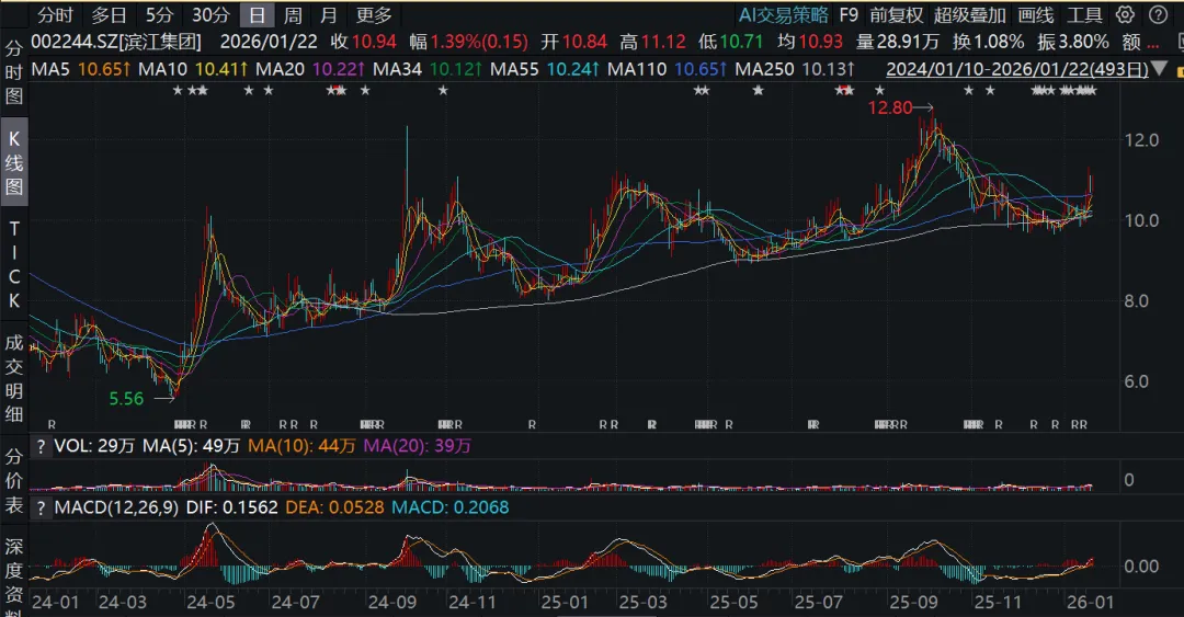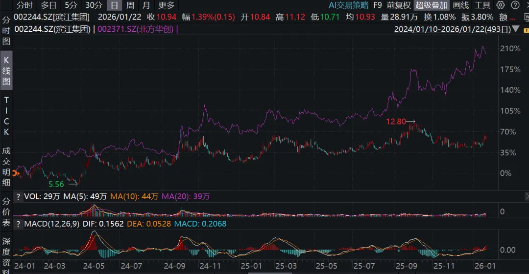 退一步说,假如这34%的战术机会真的出现了,地产也不一定能跑赢科技。我把滨江和北方华创的图放一起,立刻能发现,每次滨江有机会,北方华创也有,累计起来的涨幅还更高。