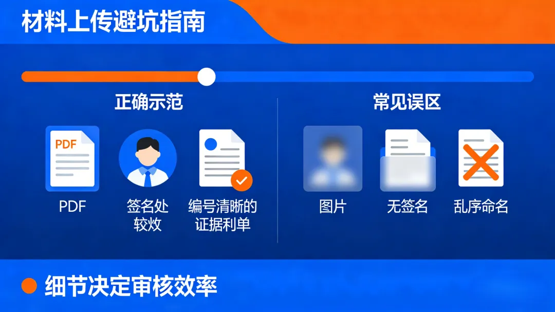 必须按照每一类里的要求上传对应的文件,保持清楚且完整的状态,建议把起诉状和证据材料并为PDF格式,能够便利法官去进行查阅。