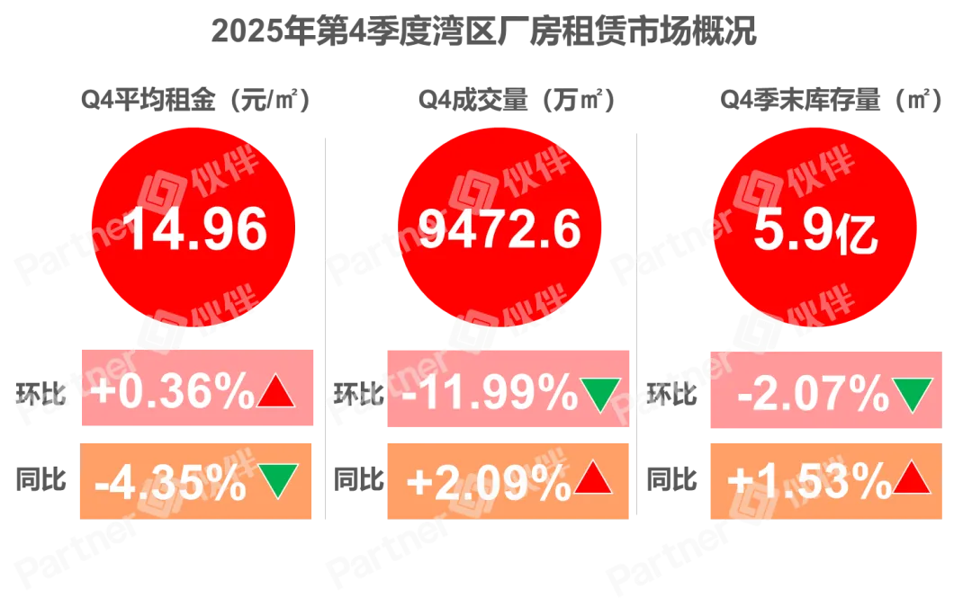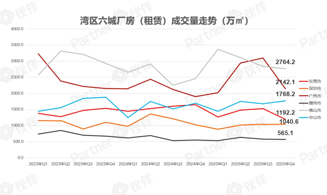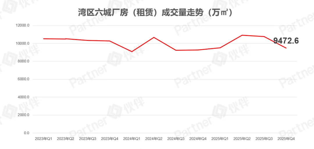 第4季度湾区六城厂房租赁市场总成交量为9472.6万㎡,环比下降11.99%,同比上涨2.9%。