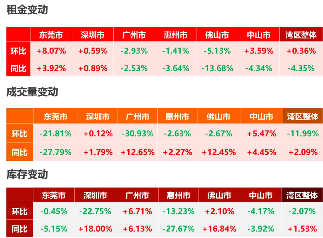 湾区除东莞深圳外,其他城市租金下降,深圳、广州、惠州、佛山、中山同比成交量上涨