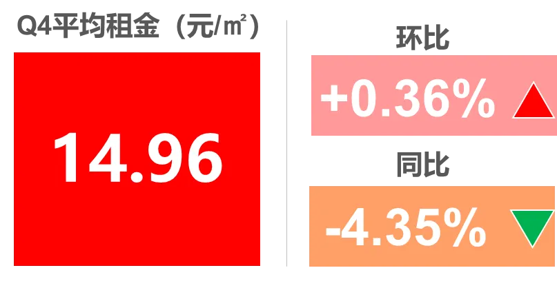 2025年第4季度六城成交均价为14.96元/㎡,六城平均租金环比上涨0.36%,同比下降4.35%。