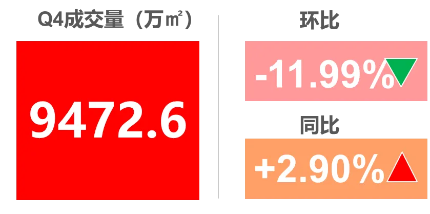 成交量:季度成交量9472.6万㎡,环比下降11.99%,同比上涨2.09%。