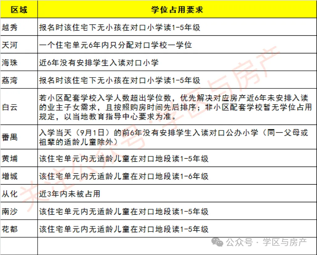 目前,广州大部分区公办小学招生,对学位房的学位占用时间都有要求,一般区都要求近六年的学位未被占用。学位一旦被占用,会影响孩子对口入学,一般由教育局统筹安排学位。