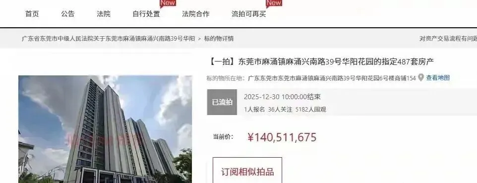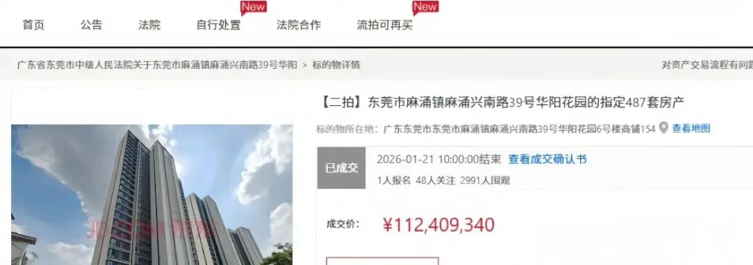 日前,东莞市麻涌镇麻涌兴南路39号华阳花园(即保利滨堂悦)的487套房产整体打包,在第二次拍卖中成交,比一拍少了近3千万元。