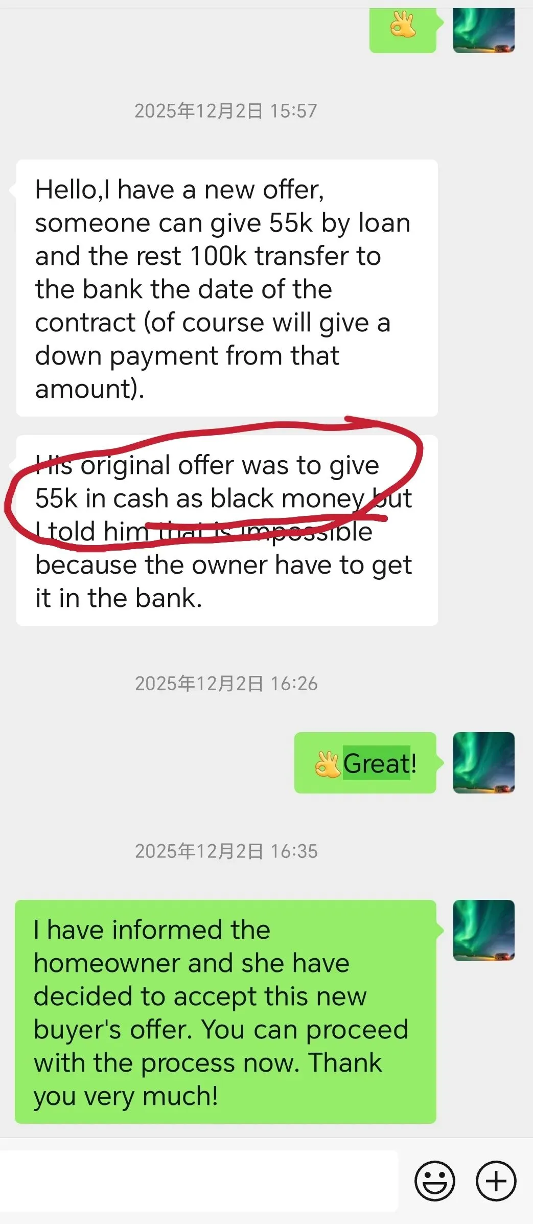 我的希腊中介果断拒绝了。因为我之前和她明确过。我们卖房子拒绝任何黑钱交易的方式。另外,现在,我这边做任何的希腊事情,包括卖房子,客户都是和希腊律师,希腊中介完全直接沟通的,全程完全透明。