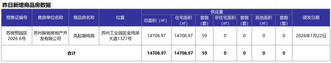 苏州1月22日住宅成交334套,新房住宅成交54套,二手房住宅成交280套,新房住宅新增59套,新房住宅可售40769套。