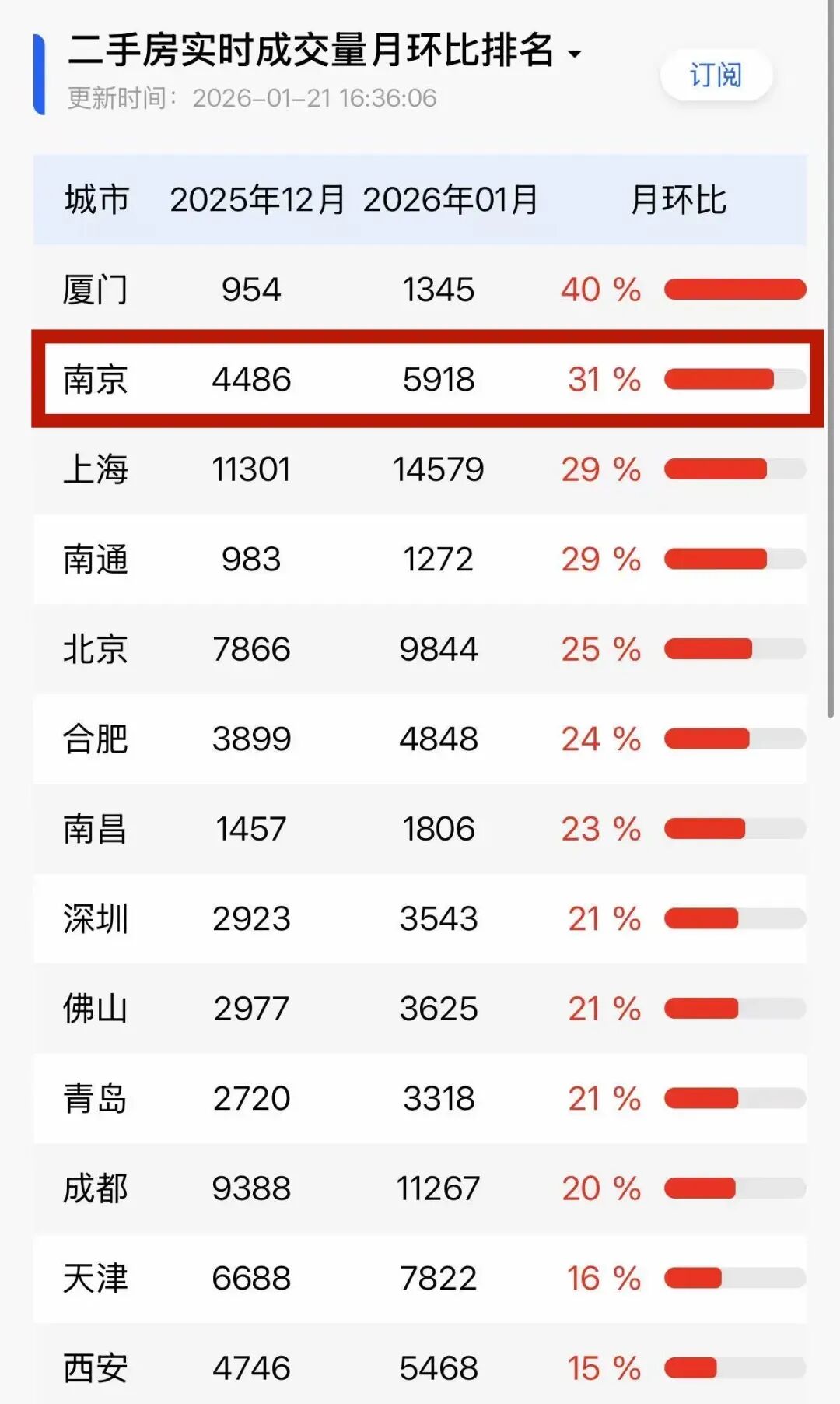 从全国范围来看,南京二手房1月成交量环比排在了全国第二,甚至超过了上海、北京、深圳等一线城市!