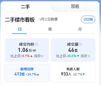 1月22日二手楼市数据显示,市场呈现“价涨量跌”的分化态势。成交均价达1.06万元/㎡,单日涨幅达5.7%,显示房价短期上行压力显著;而成交量仅46套,较前一日下降33.3%,反映交易活跃度明显收缩。新增挂牌房源413套,增长19.7%,说明卖方入市意愿增强,供应放量;但看房人数降至933人,减少10.7%,折射出买方观望情绪升温。