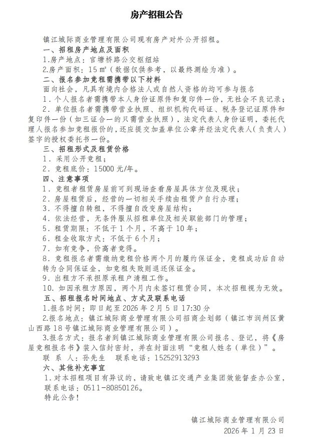 招租丨镇江城际商业管理有限公司现有房产对外公开招租