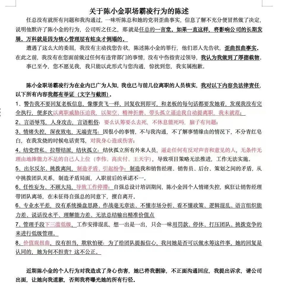 陈述信中提及:中堃高管陈小金对其职场霸凌,制造矛盾,拉帮结派,导致工作停滞,影响公司长期发展。