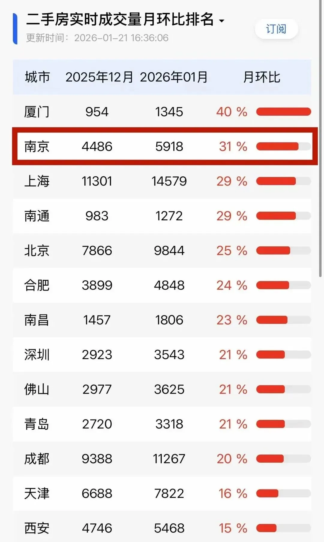最新冰山指数数据显示,南京二手房 1 月成交量环比暴涨 31%,干到了全国第二!直接甩开北京、深圳等一线核心城市,势头简直不要太猛!