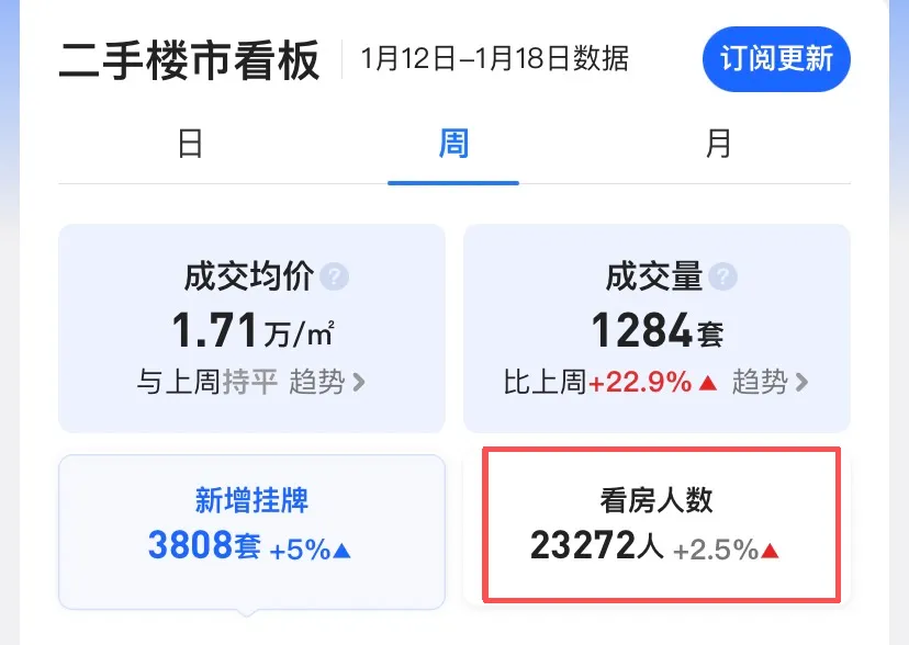 买房人的观望情绪正在消退!贝壳数据显示,1 月 5 日 - 11 日,看房人数 22134 人;1 月 12 日 - 18 日,直接涨到 23272 人。每周 2 万 + 的看房量,还在持续环比上涨,从 “蹲守观望” 到 “出门看房”,市场情绪的转变,肉眼可见!