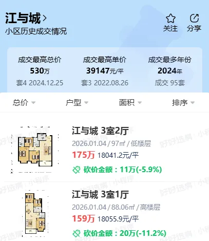 - 江与城:江核二手房天花板,小户型 150 多万就能入手,前两年这个价在桥北买电梯房都吃力!
