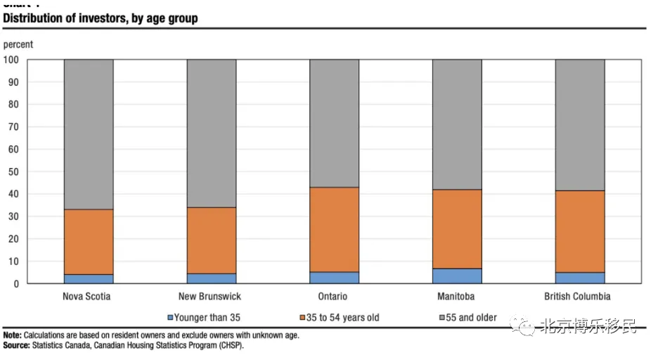 报告显示:全国大部分的房产投资者都是55岁或以上的人。从房产登记数据来看,55岁以上的房产投资者在五个省份都占据较大的份额,全部超过了一半: 其中在新斯科舍省占比最高,将近七成(为66.9%);