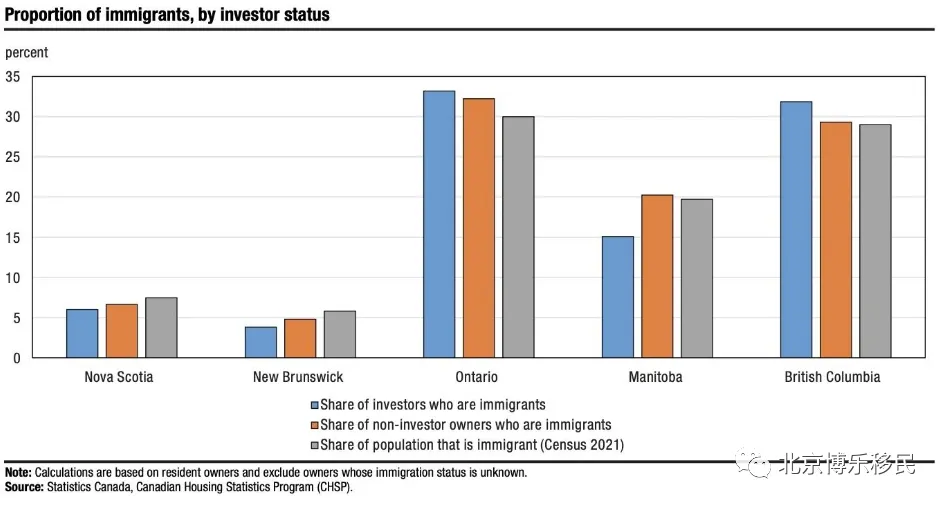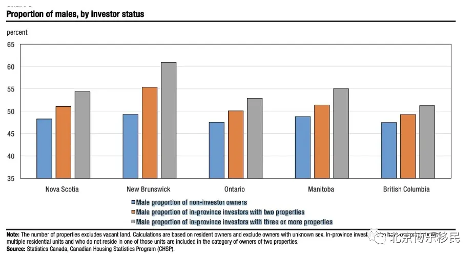 与之相对应的,便是年轻房产投资者占比的不足,尤其是35岁以下的人群,占比还不到5%。 而35岁到54岁之间的中年人,则占房产投资人群的三分之一左右。其中在安大略省为37.8%,在BC省为36.5%,在曼尼托巴省占比35.8%,在新斯科舍省和新布瑞克省占比差不多多,分别为29.1%和29.5%。 加拿大统计局分析称,造成这种现象的原因主要是时间和资金。 知名抵押贷款经纪人Ron Butler认为,这些55岁以上的房主多年前购买了首套房。随着时间的推移,他们首套房的房价上涨、房贷月供周期减少,因此他们在换房的时候有了另一种选择:与其卖掉旧房子,不如将它出租或二次抵押,以此来支付第二套房的费用。 报告显示:那些“老移民”即在2010年之前抵达加拿大的人,更有可能成为房产投资者,远高于他们在人口中所占的比例。 比如在BC省,移民所占比例(灰色图柱)约为28%,但是移民房产投资者所占比例(蓝色图柱)则约为32%。 另外,数据显示:移民们的购买力比加拿大出生的人群更强。 比如在BC省,移民投资者购买的平均房产价值为220万加元,而加拿大出生的投资者平均房产价值为161万;在安省情况也差不多,两者投资的房产平均价值为129万和89万。 加拿大统计局称,造成这种差异的一个主要原因可能是移民投资者更喜欢在人口密集的大城市买房,而大城市的房价自然比小城市要高。另一个因素则是现在加拿大的移民政策,更倾向于引进受过高等教育、拥有高薪工作的人群。 在众多的房车投资者中,不同性别的人群也有不同的表现。 首套自住房的所有者中(蓝色图柱),女性在各省的占比都高于男性; 在拥有2套房产的投资人中(橙色图柱),男女比例大致相当。比如男性投资者在新布瑞克省占比最高,为56%,在安大略省正好占50%,在BC省最低,约为48%。 对于拥有3套以上房产的投资人,性别差距则比较明显:男性占比全部超过了50%,甚至在新布瑞克省超过了60%。 需要指出的是,虽然男女房产投资者在平均收入上差距明显(比如在BC省,男性投资者收入为12.5万,女性为7万加元;在安省,男性投资者收入为11.5万,女性为7.5万),但是二则在投资房产的价值方面,几乎无差别。 虽然移民投资者购买的房产价值更高,但是他们的年收入并不如加拿大本地出生的投资者。加拿大统计局表示:绝大多数投资者的年薪都不足10万。 在BC省,本地出生的投资者平均年收入为10.5万加元,而移民投资者的平均收入为8万加元; 在安省,本地出生的投资者平均年收入为10万加元,而移民投资者的平均收入为8万加元; 在新斯科舍省,情况有所改变——本地出生的投资者平均年收入为6.5万加元,而移民投资者的平均收入为7.5万加元; 新布瑞克省情况也类似,本地出生的投资者平均年收入为6万加元,而移民投资者的平均收入为6.5万加元。