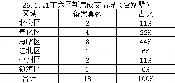 2026年1月21日宁波市六区新房共成交18套,分别为北仑区成交3套,奉化区成交4套,海曙区成交6套,江北区成交2套,鄞州区成交3套,镇海区成交1套