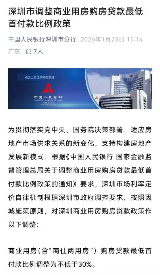深圳市场利率定价自律机制根据深圳市政府调控要求,按照因城施策原则,对深圳商业用房购房贷款政策作以下调整:商业用房(含“商住两用房”)购房贷款最低首付款比例调整为不低于30%。