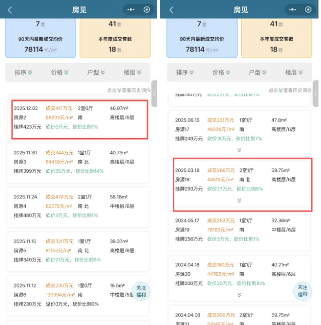该小区在2024年的成交均价基本上还在4万/㎡出头。但是从去年下半年开始,这个小区的房价开始快速反弹。12月份,该小区有一套2室住宅以8.8万元/平方米成交,正好是年初成交价的两倍。
