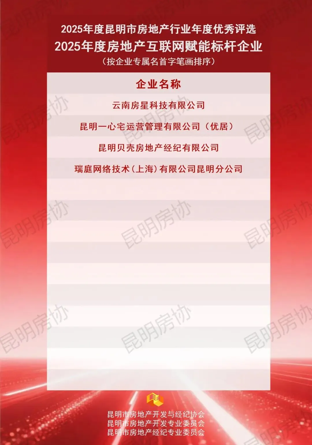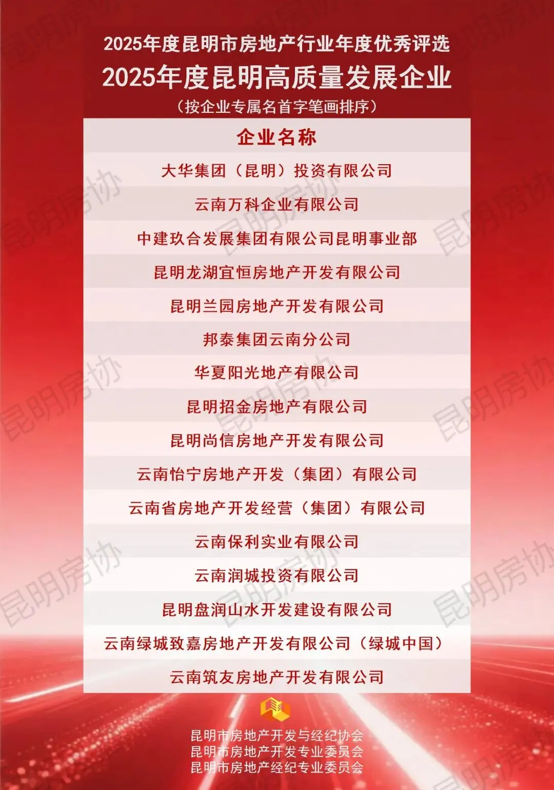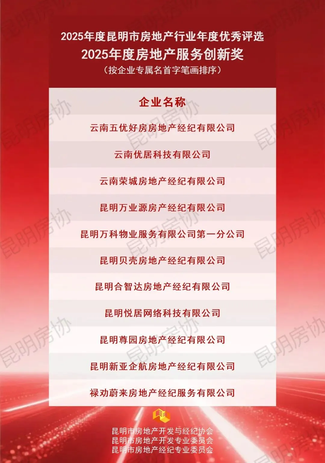 本年度奖项分为开发类与经纪类,下设TOP类(已公布)、企业类、团队类及个人类四个类别。各项奖项经企业自愿申报、综合初审及专委会专家评审环节后,报请行业主管部门审定。现将评审结果予以公示,公示期为2026年1月21日至2026年1月26日。最终评选结果将于2026年1月下旬统一发布,并由昆明房协组织颁发奖牌。如对公示名单存在异议,可在公示期内通过电话0871-63114231进行反映。诚邀各界共同为表现优异的房地产企业及个人给予认可与支持。