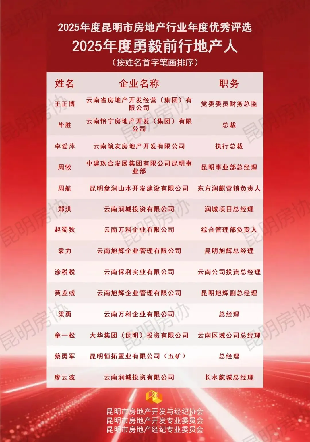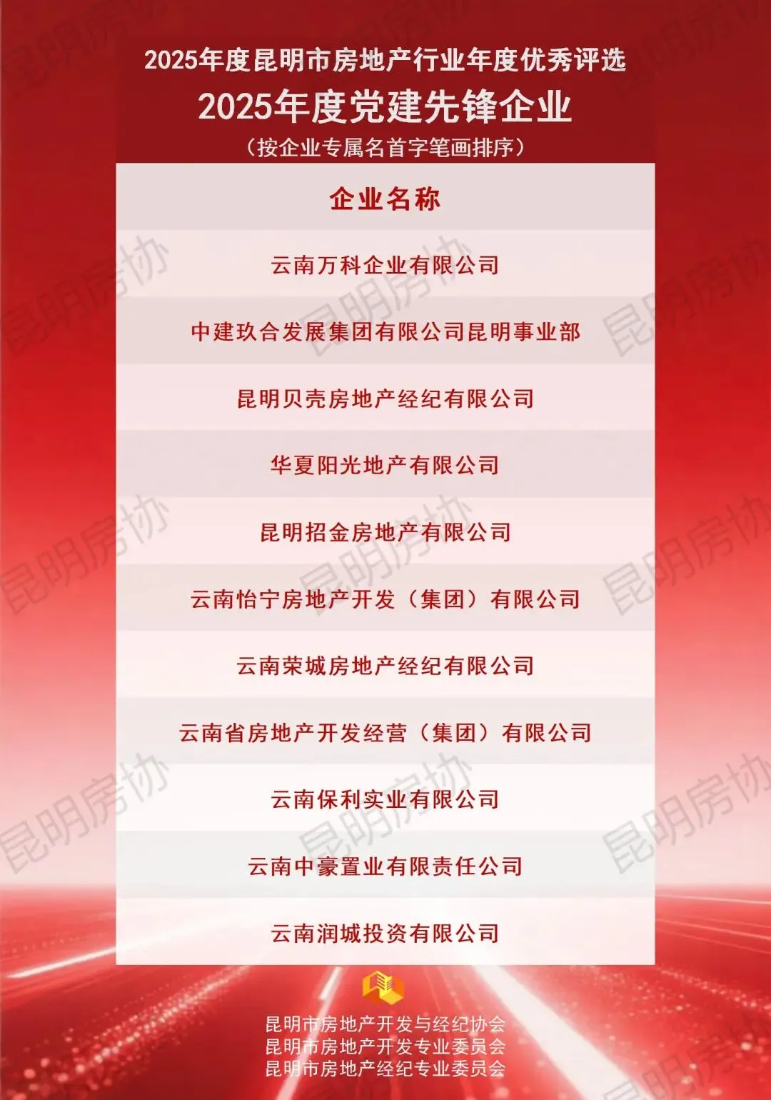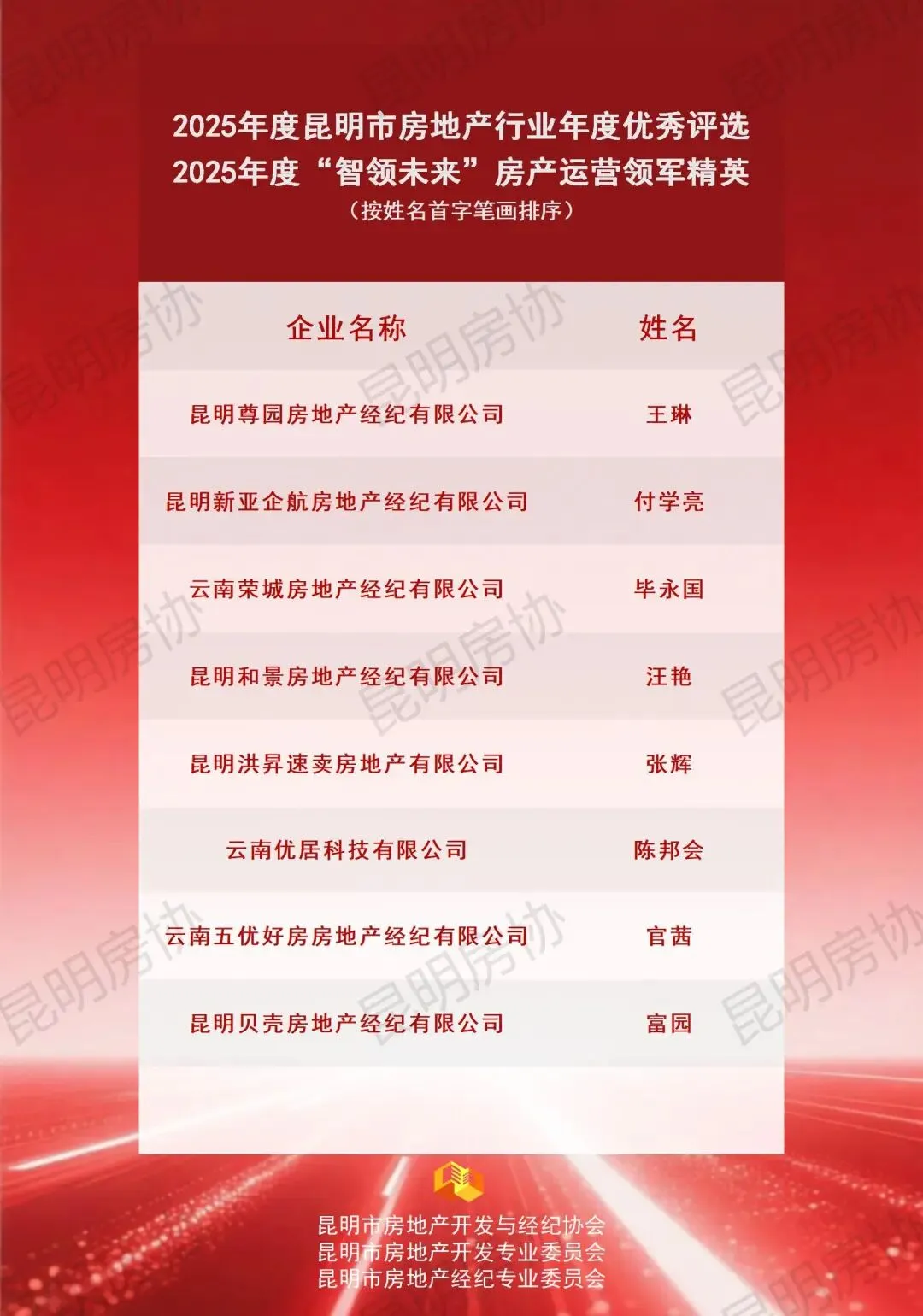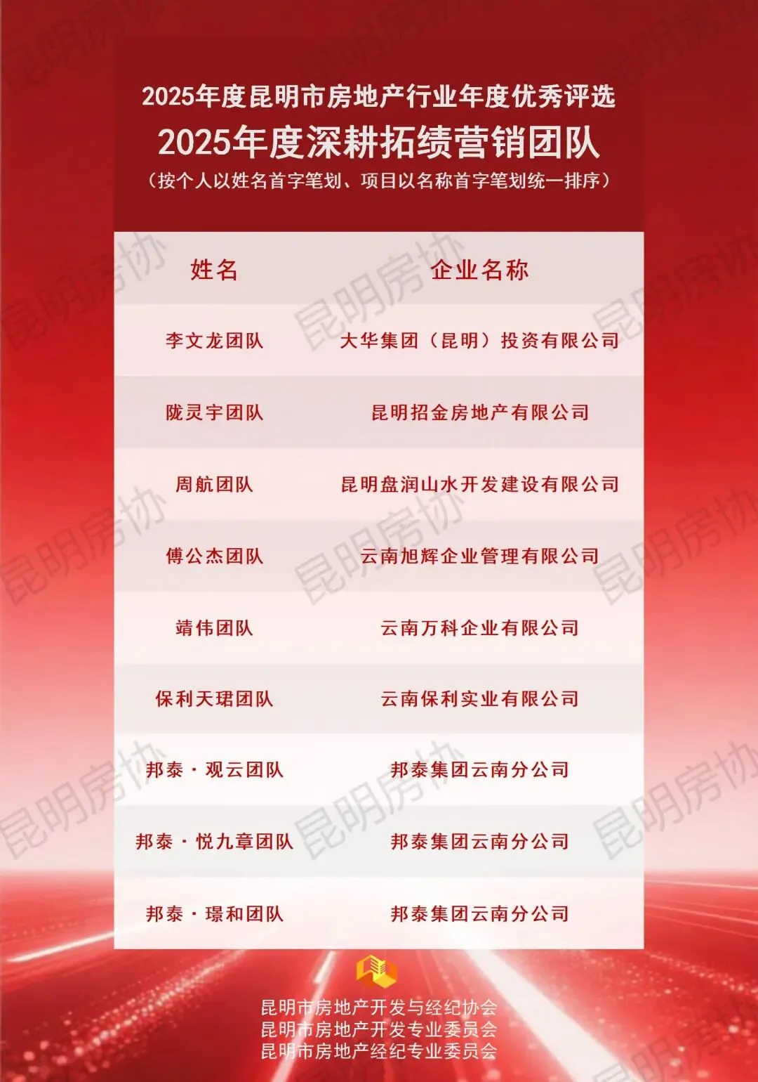 本年度奖项分为开发类与经纪类,下设TOP类(已公布)、企业类、团队类及个人类四个类别。各项奖项经企业自愿申报、综合初审及专委会专家评审环节后,报请行业主管部门审定。现将评审结果予以公示,公示期为2026年1月21日至2026年1月26日。最终评选结果将于2026年1月下旬统一发布,并由昆明房协组织颁发奖牌。如对公示名单存在异议,可在公示期内通过电话0871-63114231进行反映。诚邀各界共同为表现优异的房地产企业及个人给予认可与支持。
