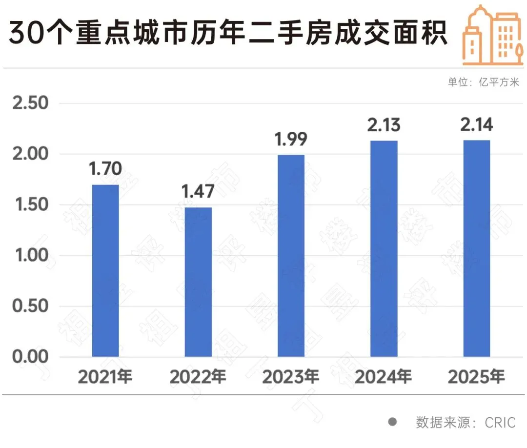 2025年重点城市二手房市场的表现非常出色,30城成交总量2.14亿平方米,创2021年至今新高。2021年新房市场达到历年成交规模最高点的时候,30城二手房成交总量仅1.7亿平方米。