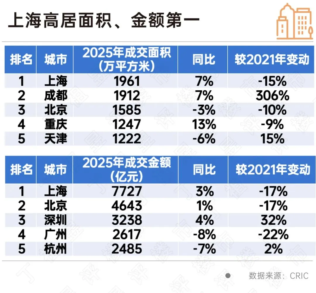 具体到城市来看,2025年上海二手房成交面积1961万平方米,同比增长7%,成交金额7727亿元,同比增长3%,上海无论是面积还是金额都高居重点城市首位。
