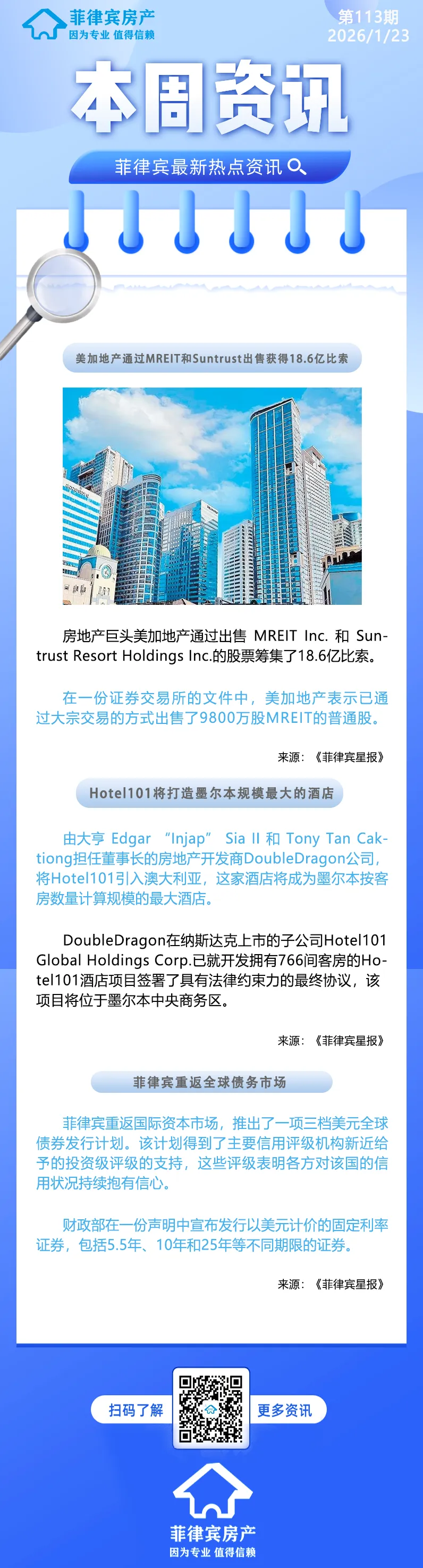 >本周资讯:美加地产通过MREIT和Suntrust出售获得18.6亿比索