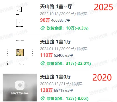 玄武的天山路小区,是中央路小学+科利华中学的双学区。里头有些20平米左右的特殊户型,现在98万就能拿下,比2020年便宜了四十万。