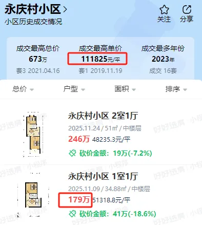 甚至,顶级学区房也放下了身段。拉萨路小学+二十九中双学区的永庆村,35平的房子,现在179万。要知道,2019年同样大的房子,单价冲破过11万。